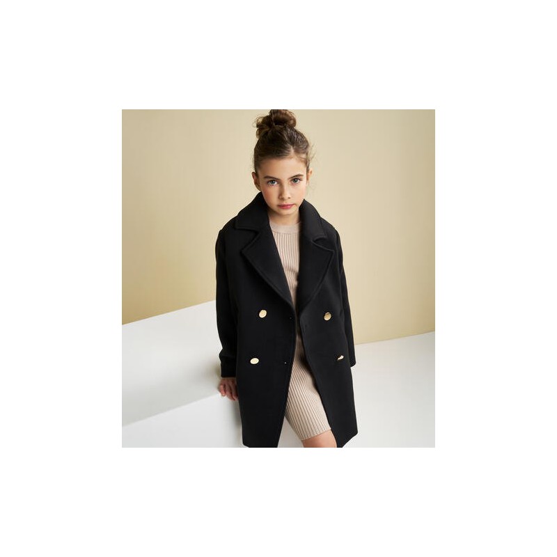 Aporta un toque de sofisticación al armario de tu pequeña con este elegante abrigo de paño en un clásico tono negro. Con un diseño de doble botonadura en dorado, esta prenda no solo es una opción de estilo, sino también una protección ideal contra el frío gracias a su tejido de alta calidad. Su corte versátil y atemporal permite combinarlo fácilmente con cualquier look, desde uno casual con jeans hasta uno más formal para ocasiones especiales. Una pieza imprescindible que ofrece abrigo y un toque de clase en los días más fríos.