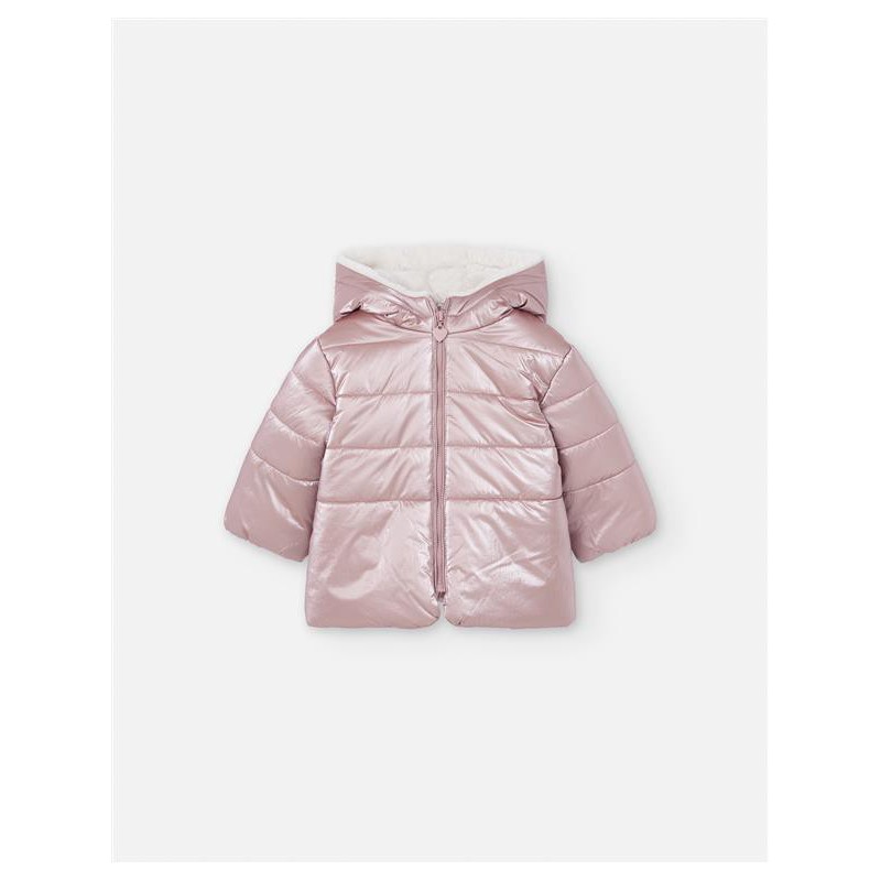 Abrigo acolchado para bebé niña en tono rosa metalizado, con diseño moderno y muy cálido. Incluye capucha forrada en suave borreguito para mayor confort y cierre delantero con cremallera. Su tejido ligero y resistente lo convierte en una prenda ideal para los días más fríos, aportando estilo y protección al mismo tiempo.
