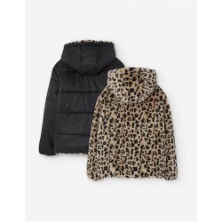 Plumífero Reversible Niña: Leopardo y Negro Liso 2 en 1