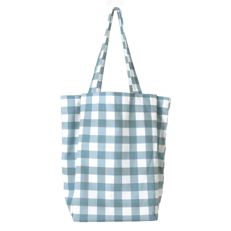 Práctico y estiloso bolso tote de tela con un clásico estampado de cuadros vichy en tonos azul y blanco. Ideal como bolso de playa, para la compra o como complemento casual para el día a día. Ligero y fácil de llevar.