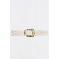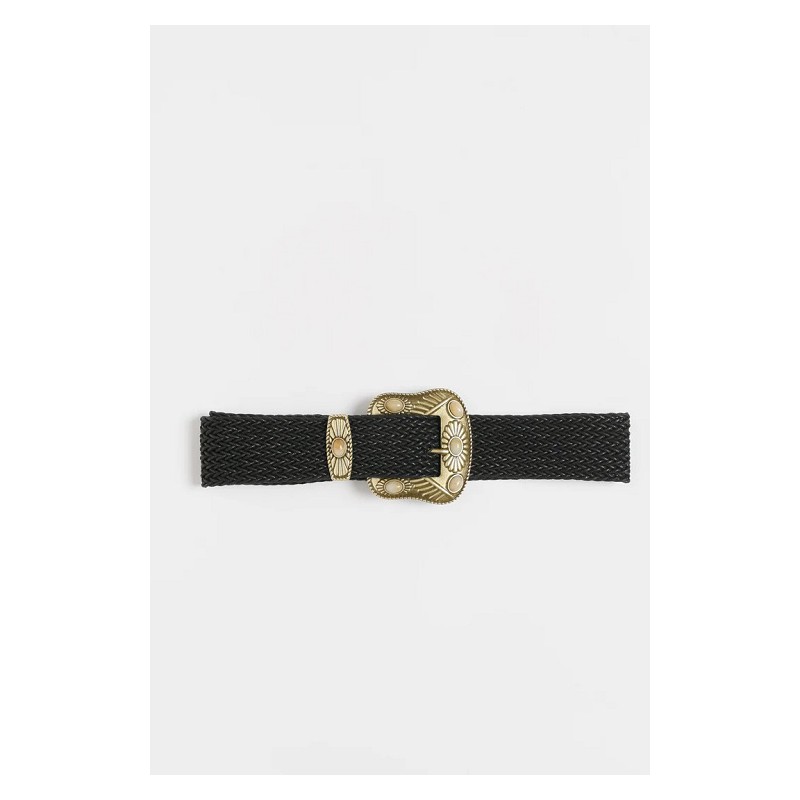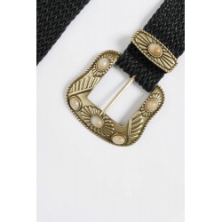 Añade un toque de sofisticación bohemia a tus looks con este elegante cinturón elástico trenzado en color negro. Su diseño versátil combina la comodidad de un tejido elástico con la elegancia de detalles metálicos dorados de inspiración étnica en la hebilla y el pasador. Perfecto para definir la cintura, complementar vestidos, faldas o pantalones, aportando un aire distintivo y lleno de estilo a cualquier conjunto.