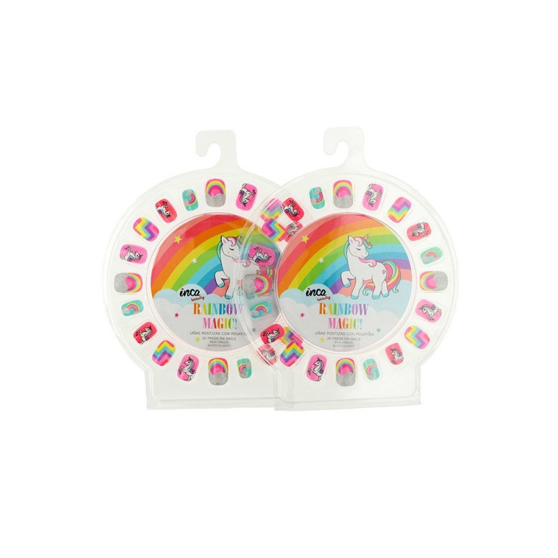 Estuche con 20 uñas postizas infantiles con dibujos de unicornio y arcoiris.