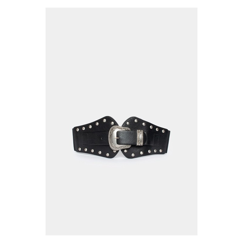 Este cinturón elástico es el accesorio ideal para definir la silueta y añadir un toque de carácter a cualquier vestido o blusa Su diseño ancho destaca por una espectacular hebilla metálica grabada de estilo retro y un decorativo de tachuelas plateadas que realzan su estética folk Gracias a su base elástica, se adapta cómodamente a la cintura proporcionando un ajuste perfecto y un acabado sofisticado a tus looks favoritos