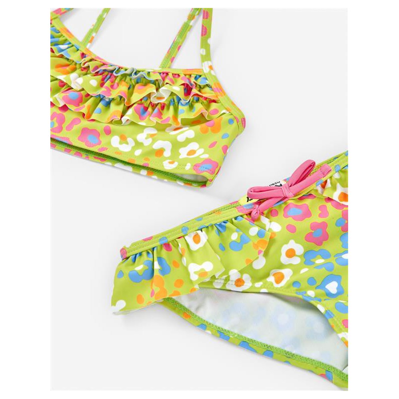 Bikini para niña de dos piezas con estampado floral en tonos vivos sobre fondo verde lima. Diseño con volantes en top y braguita, detalle de lacito rosa que aporta un toque coqueto. Ideal para el verano, combina comodidad, color y estilo en cada chapuzón. Tejido elástico y suave, pensado para acompañar todos sus movimientos con alegría.