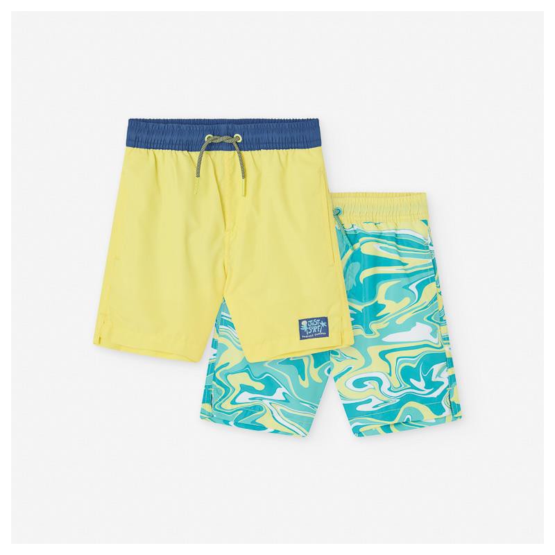 Conjunto de dos bañadores para niño. Uno amarillo liso con cintura azul y cordón. Otro estampado marmoleado en azul, verde y blanco con cintura elástica. Ideales para el agua con comodidad y estilo.