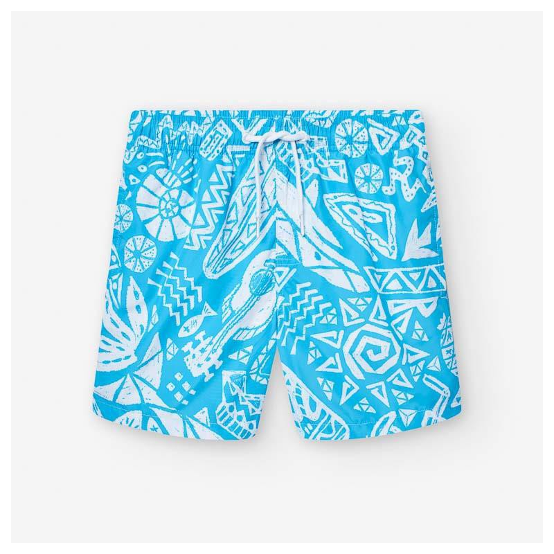 Prepárate para la diversión acuática con nuestros vibrantes bañadores de niño en un llamativo tono turquesa. Diseñados con un estampado abstracto en blanco que evoca motivos tribales y marinos, estos shorts de baño son la elección perfecta para la piscina o la playa. Cuentan con una cintura elástica ajustable mediante cordón para un ajuste seguro y cómodo, y están confeccionados en tejido de secado rápido, ideal para las aventuras veraniegas. Un diseño original y lleno de energía que garantiza comodidad y estilo en el agua.
