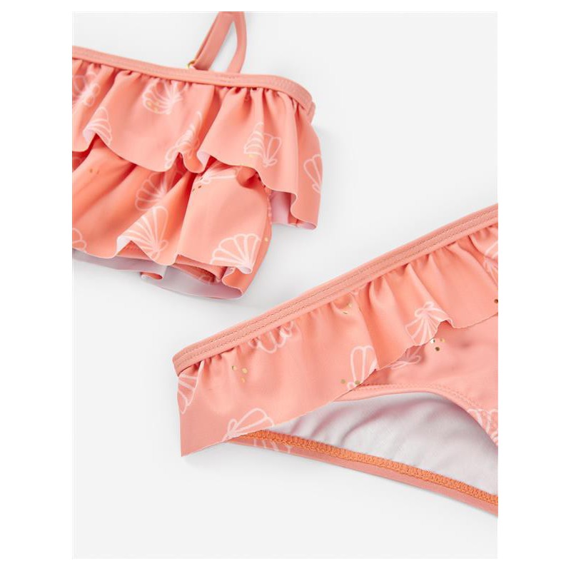Alegre bikini para niña en tono rosa melocotón con un delicado estampado de conchas marinas en dorado. El top de estilo bandeau presenta dos capas de volantes y un tirante fino. La braguita a juego también incorpora un volante decorativo. Ideal para un verano divertido y con estilo.