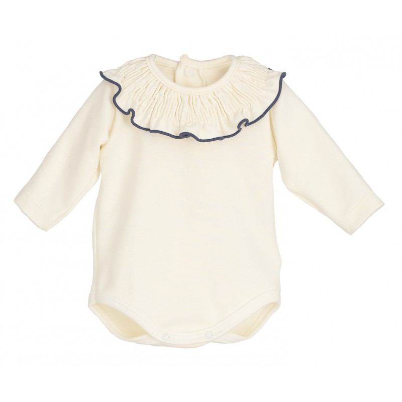 Body de bebé crudo con volante en cuello. Body de manga larga en suave algodón, de color crudo con delicado cuello volante fruncido rematado en vivo azul marino. Cierre trasero con botones a presión y corchetes en la entrepierna para mayor comodidad. Una prenda básica y elegante, ideal para combinar con cualquier conjunto.