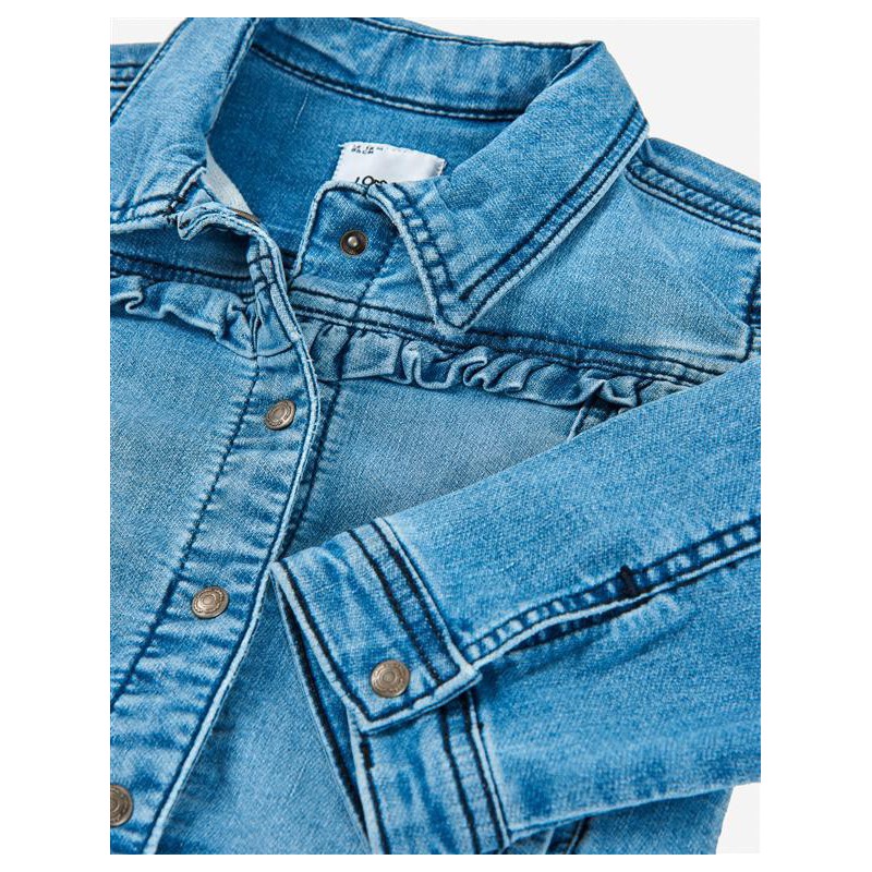 Chaqueta vaquera para bebé niña, con delicado volante frontal que aporta un toque femenino y actual. Tejido denim suave y resistente, ideal para entretiempo o looks casuales. Cierre frontal con botones a presión, perfecta para combinar con vestidos, leggings o conjuntos. Una prenda atemporal, versátil y con estilo para el armario infantil.