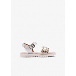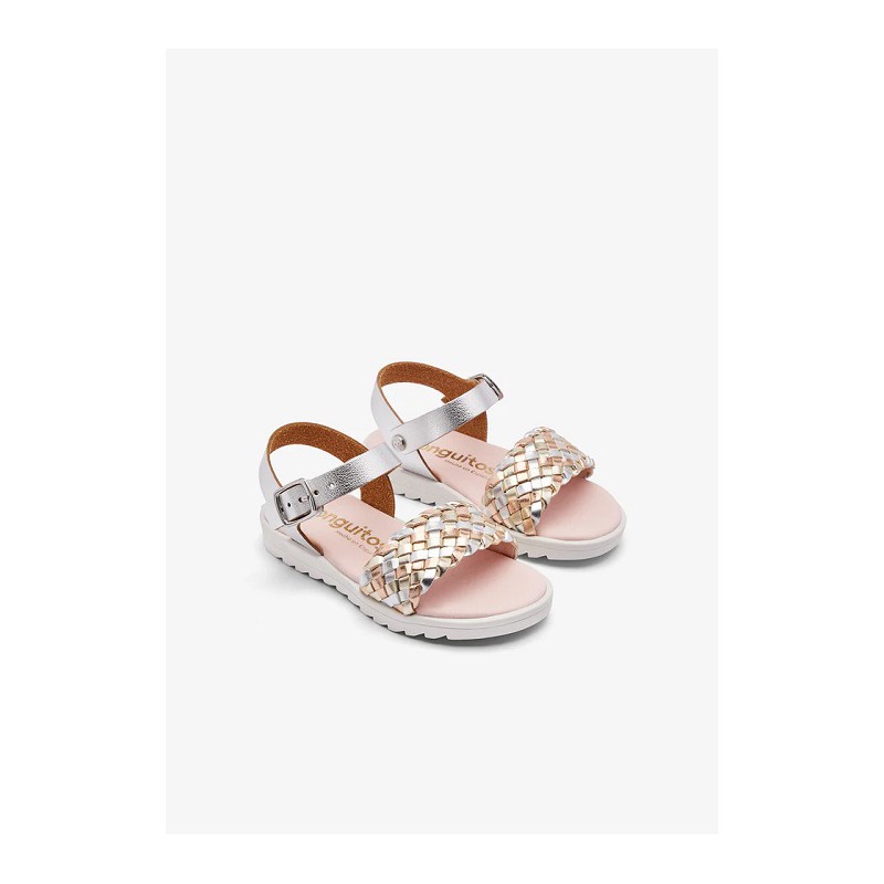 Haz que tu pequeña deslumbre en cada aventura con estas modernas sandalias para niña. Presentan un diseño elegante con tiras frontales trenzadas en tonos plateado y dorado, aportando un toque chic y brillante a sus looks de verano. La tira al tobillo en color plateado cuenta con un cierre de hebilla ajustable para garantizar una sujeción segura y cómoda. Con una plantilla suave y una suela ligera y flexible, estas sandalias son perfectas para combinar con sus vestidos, faldas o pantalones cortos favoritos, añadiendo un toque de glamour a cualquier ocasión especial o para un día a día con mucho estilo.