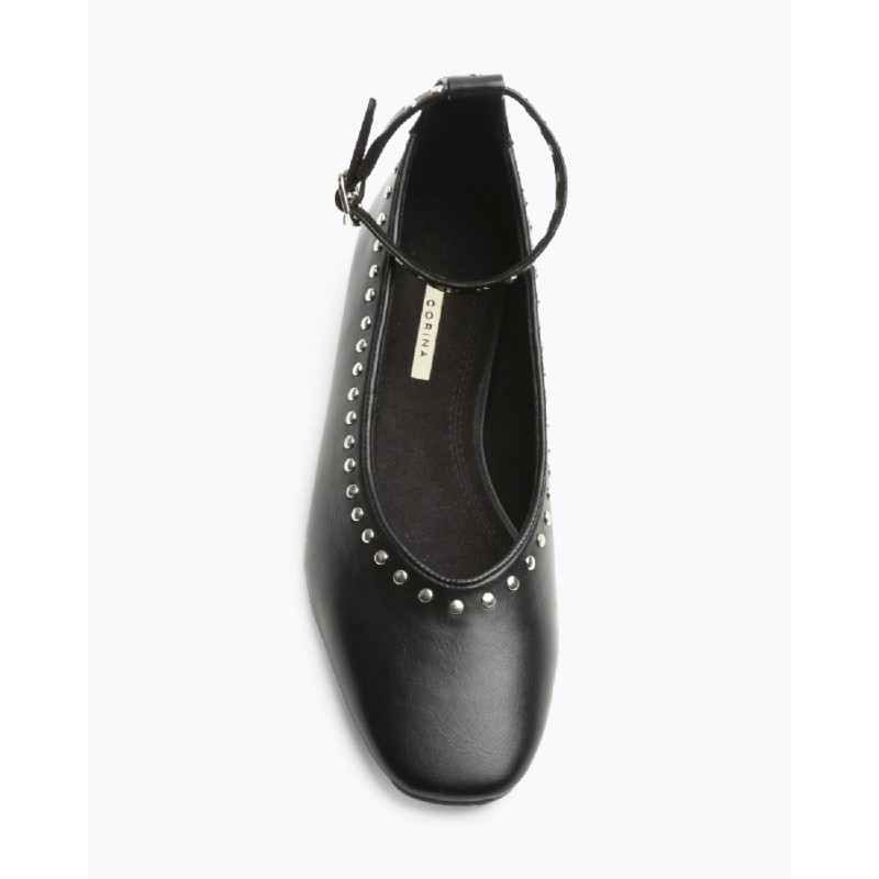 Añade un toque de rebeldía y estilo a tus looks con estas elegantes y modernas bailarinas. Su diseño en color negro y punta redondeada se complementa a la perfección con una fila de tachuelas plateadas que recorren el contorno del zapato, brindando un detalle llamativo y sofisticado. La pulsera ajustable con hebilla al tobillo no solo asegura un ajuste perfecto, sino que también añade un toque extra de estilo. Son el calzado ideal para quienes buscan comodidad y un diseño atrevido.