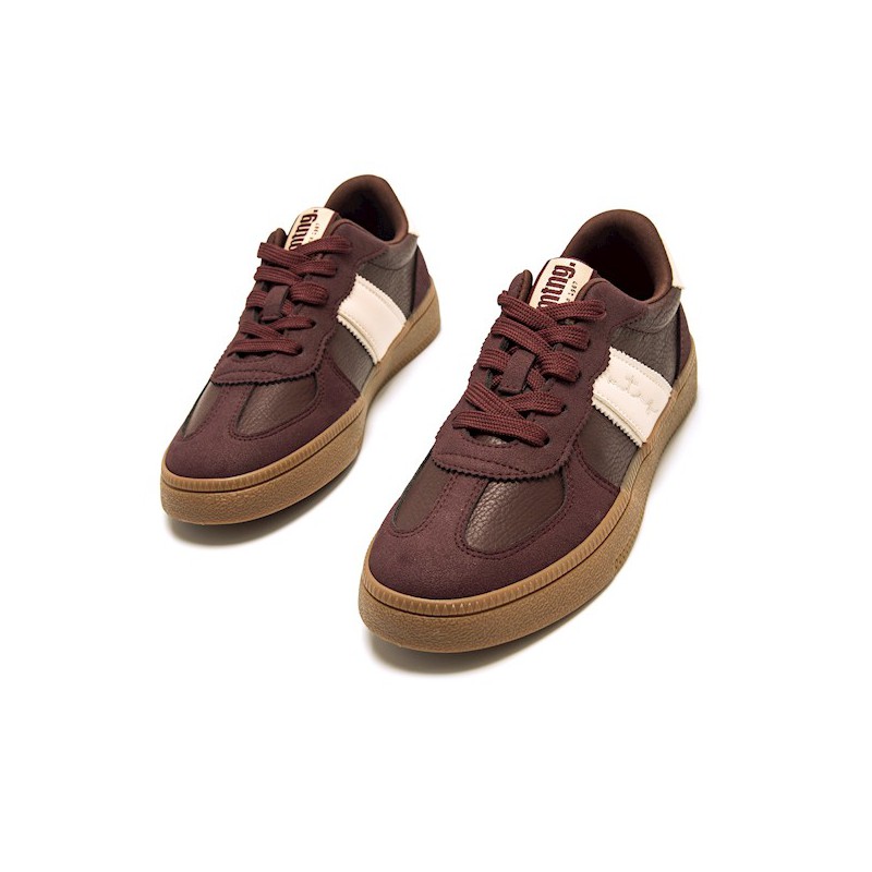 Confeccionadas con una mezcla de texturas, incluyendo serraje (gamuza) y un acabado tipo piel en sofisticados tonos granate oscuro y marrón, estas zapatillas destacan por la banda lateral en color crema y la suela de goma caramelo. Su diseño de corte bajo y cierre de cordones tradicional las hace perfectas para un estilo deportivo y a la vez muy chic.