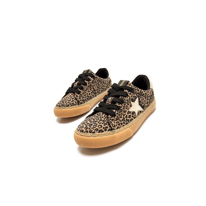 Zapatillas de niña con estampado de leopardo y detalle de estrella lateral en glitter. Con cordones negros y suela de goma en color caramelo, son un modelo cómodo, resistente y lleno de estilo. Unas deportivas versátiles que combinan fácilmente con looks casuales y urbanos, ideales para dar un toque atrevido y divertido al outfit diario.