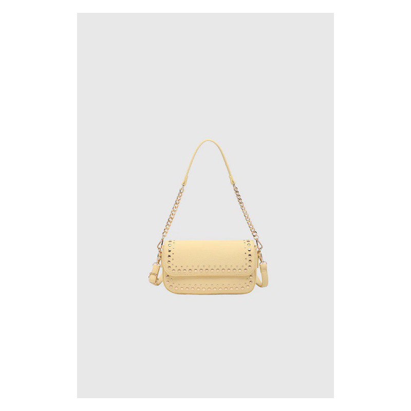 Este elegante bolso de mano es el accesorio definitivo para completar cualquier look de la colección Teen & Mun con un toque de estilo y personalidad Su diseño destaca por una solapa frontal decorada con hileras de tachuelas metálicas que aportan un aire moderno y sofisticado Cuenta con una versátil asa de hombro que combina eslabones de cadena dorada con material a juego, además de una correa larga ajustable para llevarlo cómodamente tipo bandolera Fabricado con una textura granulada de alta calidad, este modelo está disponible en dos colores esenciales para combinar con cualquier prenda de la temporada: el vibrante amarillo y el clásico crudo.