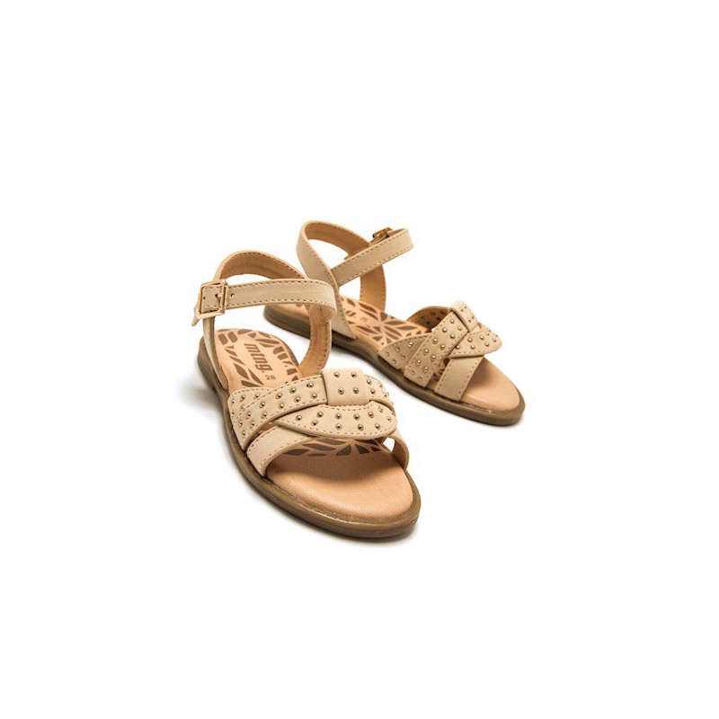 Estas sandalias son el calzado ideal para que las niñas disfruten del buen tiempo con un toque de sofisticación y brillo Su diseño destaca por estar confeccionado en un material suave de color beige arena, un tono neutro que combina fácilmente con cualquier prenda del armario Presenta una estructura de tiras cruzadas en la parte delantera decoradas con pequeñas tachuelas doradas, que aportan un aire moderno y chic Cuenta con un cierre de hebilla ajustable al tobillo para garantizar una sujeción segura en cada paso y una suela ligera que asegura el máximo confort durante todo el día Es un modelo versátil y elegante, perfecto para lucir con el Pantalón Culotte Rosa o con cualquier vestido veraniego.