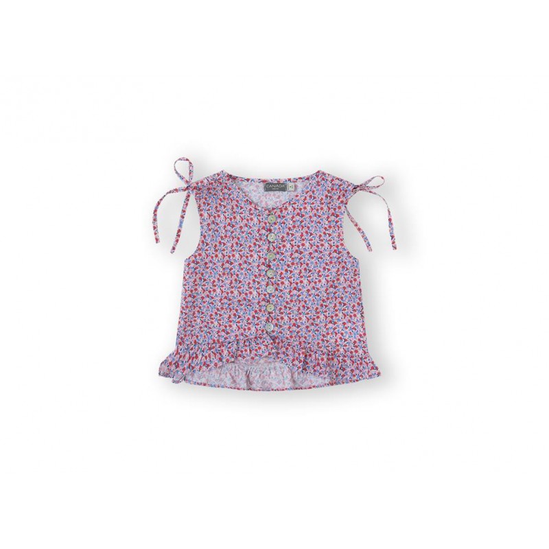 Añade un toque alegre y fresco al armario de tu pequeña con esta preciosa blusa sin mangas de niña. Con un encantador estampado floral en tonos vibrantes, botones delanteros y delicados lazos en los hombros, esta blusa es ideal para los días soleados. Su corte cómodo y su suave tejido la convierten en una opción perfecta para el día a día o para ocasiones especiales.