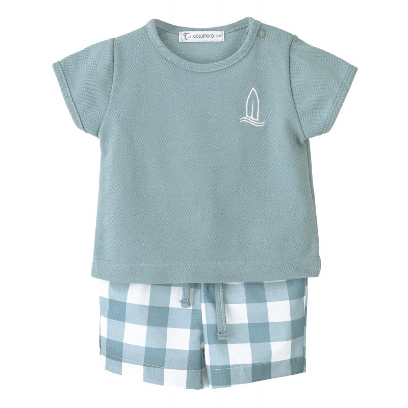 Conjunto infantil para niño, ideal para los días cálidos. Camiseta de algodón en tono verde agua con detalle bordado de tabla de surf, y short de cuadros grandes en blanco y verde a juego, con cintura elástica y cordón ajustable. Su diseño fresco, cómodo y moderno lo convierte en el look perfecto para verano, paseos al aire libre o vacaciones en la playa. Un conjunto versátil, con estilo y fácil de combinar.