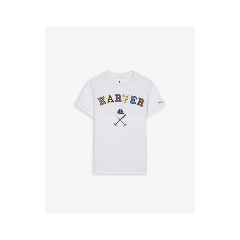 El estampado gráfico en el pecho destaca por la palabra "HARPER" en letras de diferentes patrones y colores, combinadas con los elementos clásicos del polo, como el casco y los palos cruzados. Confeccionada en suave algodón, esta camiseta de niño es muy cómoda, transpirable y perfecta para el día a día, garantizando el máximo confort en todas sus actividades.