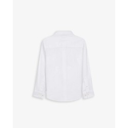 Camisa blanca de niño de manga larga, confeccionada en tejido de alta calidad, suave y resistente para garantizar comodidad durante todo el día. Su diseño clásico con cuello camisero y botones delanteros la convierte en una prenda versátil, ideal tanto para ocasiones especiales como para un look más casual y elegante. El pequeño bordado en el pecho aporta un detalle distintivo que realza su estilo. Perfecta para combinar con pantalones chinos, vaqueros o bermudas y crear conjuntos únicos.