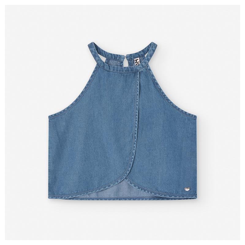 Eleva su estilo con nuestro top denim de cuello halter, una prenda imprescindible para el verano. Confeccionado en tejido vaquero ligero y suave, este top presenta un corte moderno con un elegante diseño cruzado en la parte frontal que añade un toque sofisticado y original. Su cuello alto y tirantes anchos garantizan comodidad y sujeción, mientras que la silueta fluida lo hace perfecto para los días más cálidos. Ideal para combinar con faldas o shorts, es una opción versátil y de tendencia para cualquier ocasión informal.