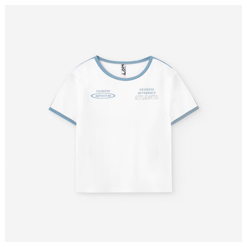 Camiseta blanca para niña con detalles tipográficos en el pecho y ribetes en azul que aportan un toque sporty y moderno. Confeccionada en algodón suave, ideal para el día a día, combinando estilo y comodidad. Su diseño corto y actual la convierte en una prenda versátil para looks urbanos y desenfadados.