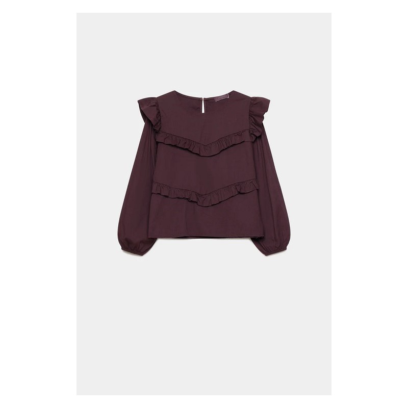 Blusa teen en color berenjena con un diseño moderno y muy femenino. Presenta volantes frontales en forma de “V” que aportan movimiento y estilo, así como mangas largas abullonadas con puño elástico para un ajuste cómodo. Su tejido ligero la hace perfecta para combinar con jeans, faldas o pantalones más arreglados, ideal para looks de entretiempo o para ocasiones especiales. Cierre trasero con botón para facilitar la puesta.