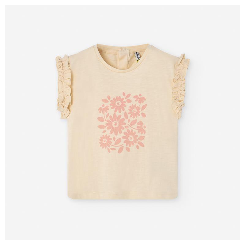 Descubre la dulzura y comodidad con esta encantadora camiseta de niña en un suave tono beige o crema. Destaca por su delicado estampado floral en rosa palo en la parte frontal, que añade un toque romántico y femenino. Los volantes fruncidos en los hombros aportan un detalle adorable y un estilo único, perfecto para las pequeñas más coquetas. Confeccionada en tejido suave y transpirable, esta camiseta es ideal para el día a día, ofreciendo máxima comodidad para jugar y moverse libremente. Un básico versátil para combinar con faldas, shorts o pantalones, creando looks veraniegos e irresistibles.