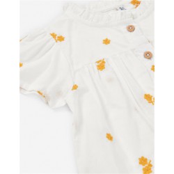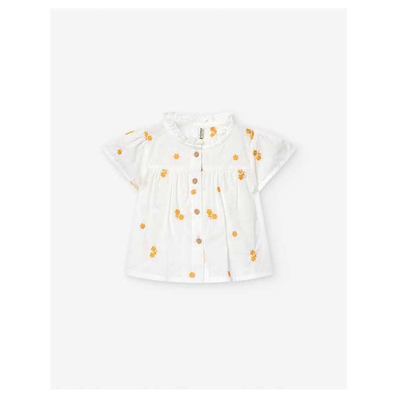 Dulce blusa blanca para bebé con delicado bordado de pequeñas flores amarillas. Cuello volante y manga corta. Cierre frontal con botones. Tejido suave y ligero. Ideal para un look tierno y cómodo.