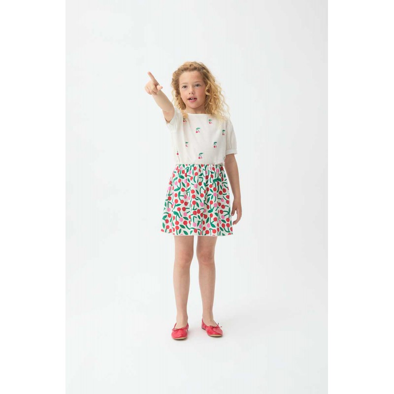 Este top es la prenda perfecta para aportar un aire dulce y refrescante a los looks veraniegos de las más pequeñas Su diseño destaca por un encantador estampado de cerezas rojas distribuidas de forma delicada sobre un fondo blanco puro, creando un contraste vibrante y muy alegre Confeccionado en un tejido ligero y transpirable, presenta un cuello redondo sencillo y unas favorecedoras mangas cortas con un ligero volumen abullonado que añade un toque romántico a la pieza Es una prenda extremadamente versátil que combina a la perfección con la falda de cerezas a juego para un conjunto total o con unos pantalones cortos para un estilo más casual y divertido.