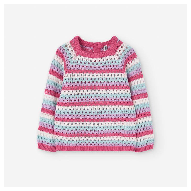 Jersey niña tricot calado de rayas de tres colores turquesa, fucsia y blanco. By Losan.
