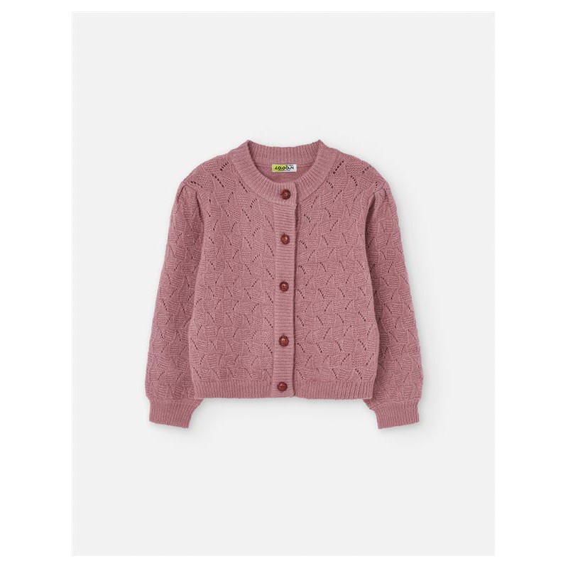 Chaqueta de punto para niña en un bonito tono rosa empolvado. Con delicado calado en forma de hojas y botones delanteros a juego, es una prenda ideal para los días frescos. Su tejido suave y cómodo aporta calidez sin perder ligereza, perfecta para combinar con vestidos, blusas o camisetas. Una chaqueta clásica con un toque romántico que no puede faltar en el armario de tu pequeña.