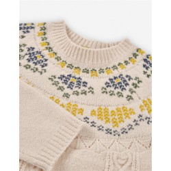 El diseño combina el clásico estampado Fair Isle en el canesú (la parte superior del pecho y hombros) con motivos florales o geométricos en tonos amarillo, azul marino y malva.