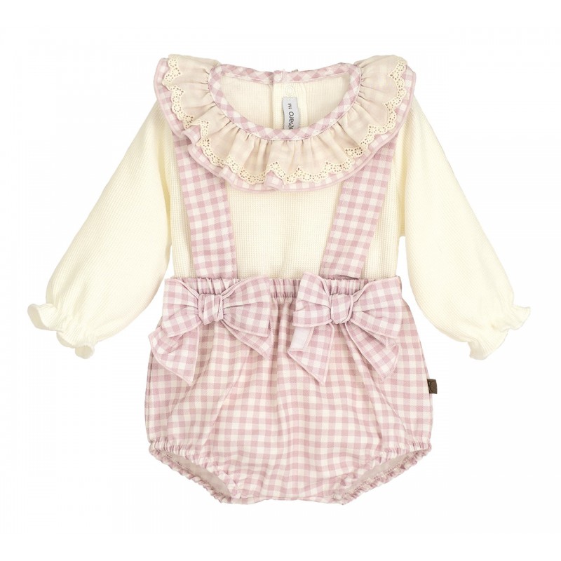 El peto bombacho bebé rosa con volantes – cuadros vichy y lazos es un conjunto encantador y elegante, compuesto por una camiseta de manga larga en tono crema con delicado cuello volante y puntilla bordada, junto a un peto bombacho de estampado vichy rosa y blanco con tirantes decorados con dos grandes lazos frontales. Confeccionado en algodón suave y transpirable, es ideal para cuidar la piel del bebé y perfecto para entretiempo, primavera y otoño. Incluye cierre trasero y goma en las piernas para facilitar el cambio del pañal. Una prenda perfecta para ocasiones especiales, sesiones de fotos o para lucir un look diario con estilo clásico y dulce.