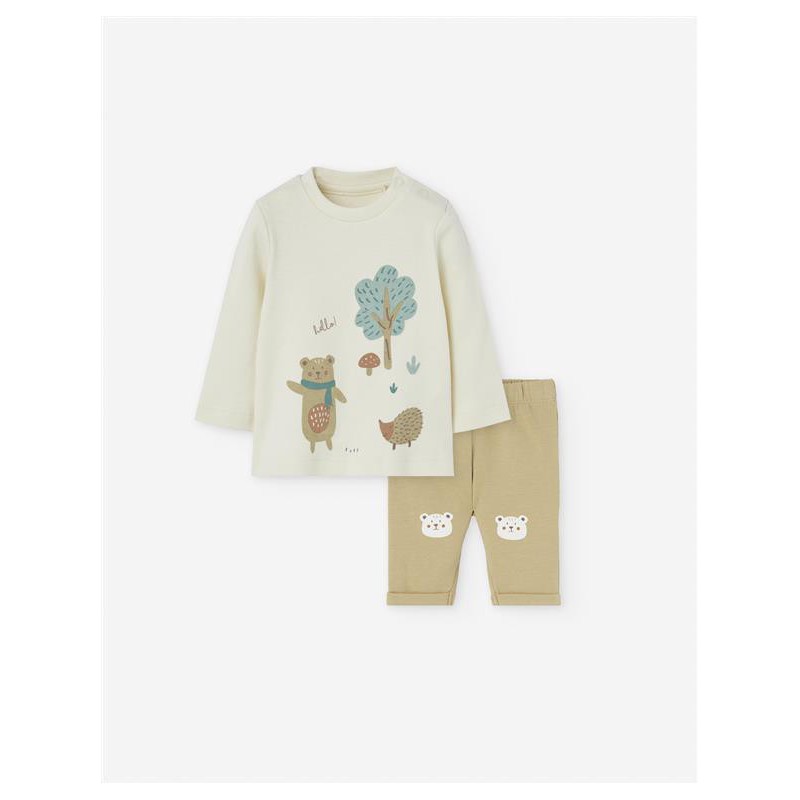 Este conjunto de dos piezas es perfecto para el día a día de tu bebé. La camiseta, en color crudo, presenta un encantador estampado de un oso y un erizo en el bosque. Los pantalones a juego, en color beige, tienen un diseño de parches de oso en las rodillas.