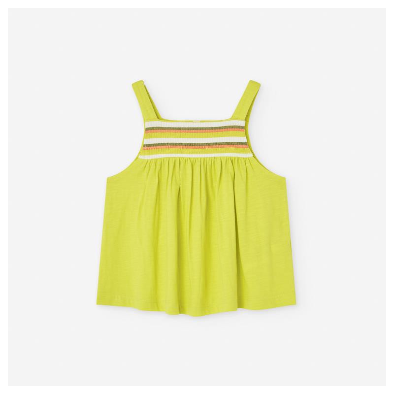 Aporta un toque de alegría al armario de tu pequeña con esta adorable blusa infantil en un vibrante tono amarillo lima. Su diseño fresco y ligero, ideal para la primavera y el verano, destaca por el detalle de tirantes con rayas multicolor, añadiendo un toque divertido y original. Confeccionada para ofrecer máxima comodidad y libertad de movimiento, es perfecta para cualquier aventura diaria, desde jugar en el parque hasta eventos especiales. ¡Combínala fácilmente con shorts, faldas o pantalones para crear looks veraniegos irresistibles!