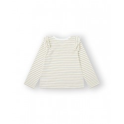 Añade un toque de brillo y dulzura al armario de tu pequeña con esta encantadora camiseta de manga larga. Confeccionada en un suave y cómodo tejido de punto en color blanco crudo, presenta un elegante estampado de rayas horizontales finas en un tono marrón topo o dorado sutil.