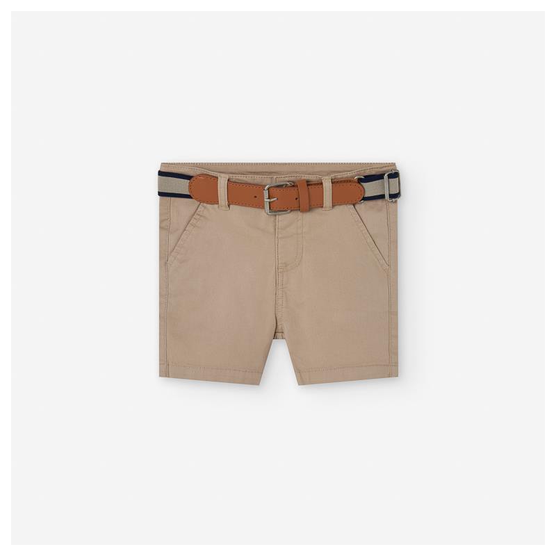 Elegante bermuda color beige para niño con cinturón de polipiel marrón y detalles de rayas azul marino y blanco. Corte recto y cómodo. Ideal para un look casual con estilo.
