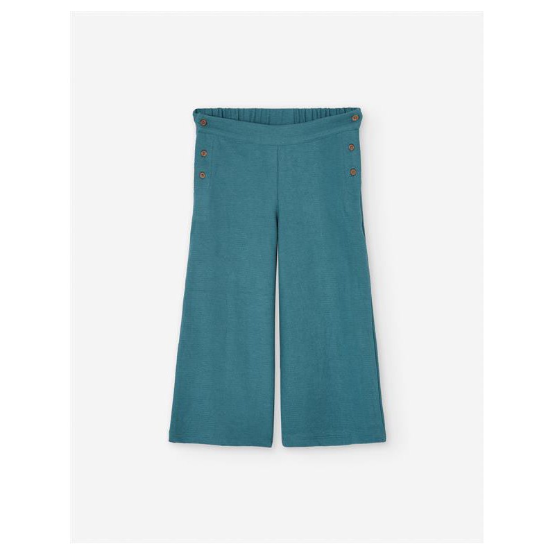 El diseño se caracteriza por su corte midi y ancho y los botones decorativos en la cintura a cada lado, que le dan un toque náutico o retro. Cuenta con una cómoda cintura elástica en la parte trasera para un ajuste fácil y rápido. Es la prenda ideal para combinar con tops básicos o camisas.