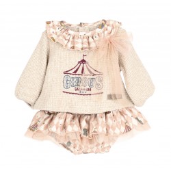 Sumérgete en un mundo de fantasía con este encantador conjunto de dos piezas para bebé, perfecto para sus primeras aventuras. Confeccionado en un suave punto en un cálido tono beige, la blusa destaca por su bordado temático de circo en el centro y un delicado lazo de tul decorativo en el hombro. El cuello babero con volantes y la braguita con volantes a juego presentan un adorable estampado de fantasía con motivos de circo y tul superpuesto, añadiendo un toque mágico y único. Un conjunto ideal para ocasiones especiales, que combina comodidad y un diseño lleno de encanto.