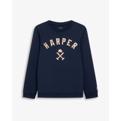 Detalle Varsity: Presenta un gran parche o aplicación bordada con la palabra "HARPER" y un motivo de palas cruzadas en colores beige y camel, inspirada en la estética de las universidades americanas.
