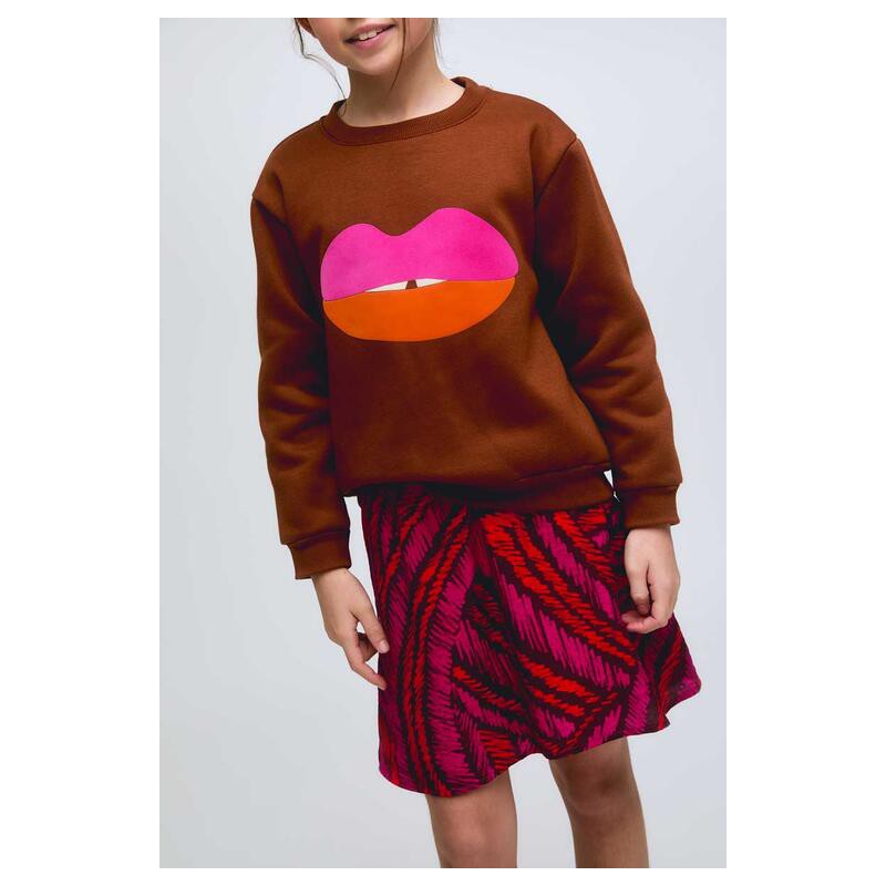 Sudadera Marrón para Chica con Gráfico de Labios Estilo Pop y Divertido