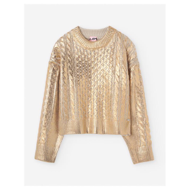 Este jersey dorado para niña ilumina cualquier look con su acabado brillante y su tacto suave. El diseño combina trenzas clásicas con un efecto metalizado que convierte una prenda cómoda en una pequeña joya para el armario infantil. Cuenta con cuello redondo, manga larga y un patrón relajado que permite libertad total de movimiento. Perfecto para Navidad, celebraciones o para añadir un toque especial a un conjunto diario. Ideal para niñas que adoran brillar sin renunciar a la comodidad.