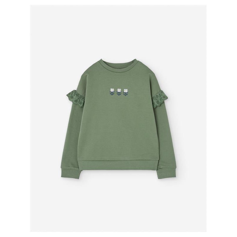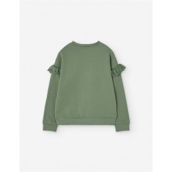 Sudadera verde de niña con detalles románticos que la hacen única. Confeccionada en tejido suave y cómodo, presenta volantes de encaje en las mangas y un delicado bordado de flores en el pecho. Una prenda versátil y moderna, ideal para combinar con vaqueros, leggings o faldas, aportando estilo y confort en el día a día.