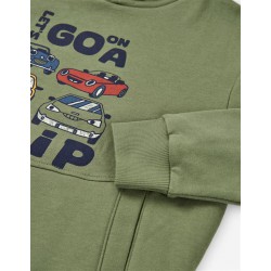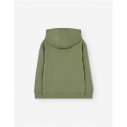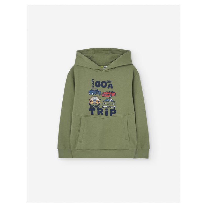 Sudadera para niño en color verde kaki con divertido estampado de coches y mensaje "Let’s go on a road trip". Con capucha y bolsillo tipo canguro, ideal para los días más frescos. Su tejido suave y cálido ofrece máxima comodidad para el día a día, perfecta para combinar con vaqueros o joggers en looks casuales y llenos de estilo.