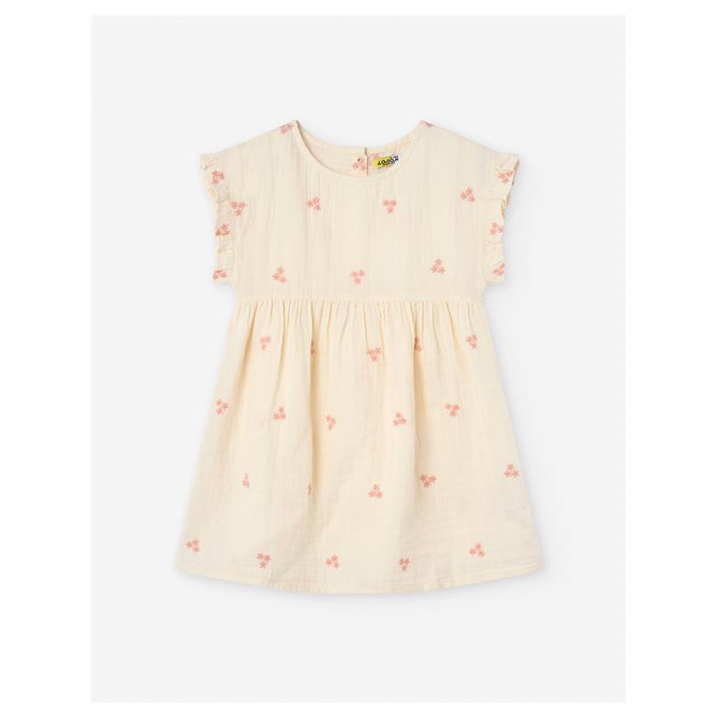 Este encantador vestido infantil de algodón orgánico es ideal para los días cálidos de primavera y verano. Confeccionado en un suave tono crema y decorado con delicadas flores bordadas en color rosa, este vestido destaca por su diseño fresco y cómodo. Las mangas con volantes y el corte suelto aportan libertad de movimiento, perfecto para niñas activas y con estilo.