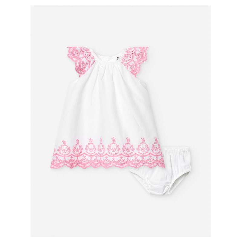 Precioso vestido blanco para bebé niña con delicado bordado inglés en tono rosa en el bajo y los volantes de los hombros. Incluye braguita a juego. Ideal para vestir a tu pequeña con dulzura y frescura este verano.