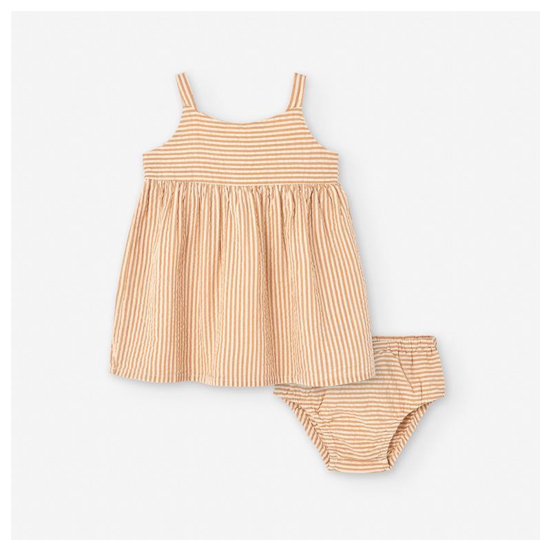 Conjunto de bebé niña compuesto por vestidito de tirantes y braguita a juego, en suave tejido de algodón con estampado de rayas en color beige. Un diseño ligero, fresco y cómodo para los días calurosos de verano. El vestido tiene una caída fluida y favorecedora, ideal para mantener a tu bebé fresca y con libertad de movimiento. Perfecto para paseos, vacaciones o cualquier ocasión especial. Un básico atemporal y versátil en el armario de verano de tu peque.