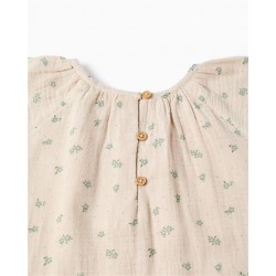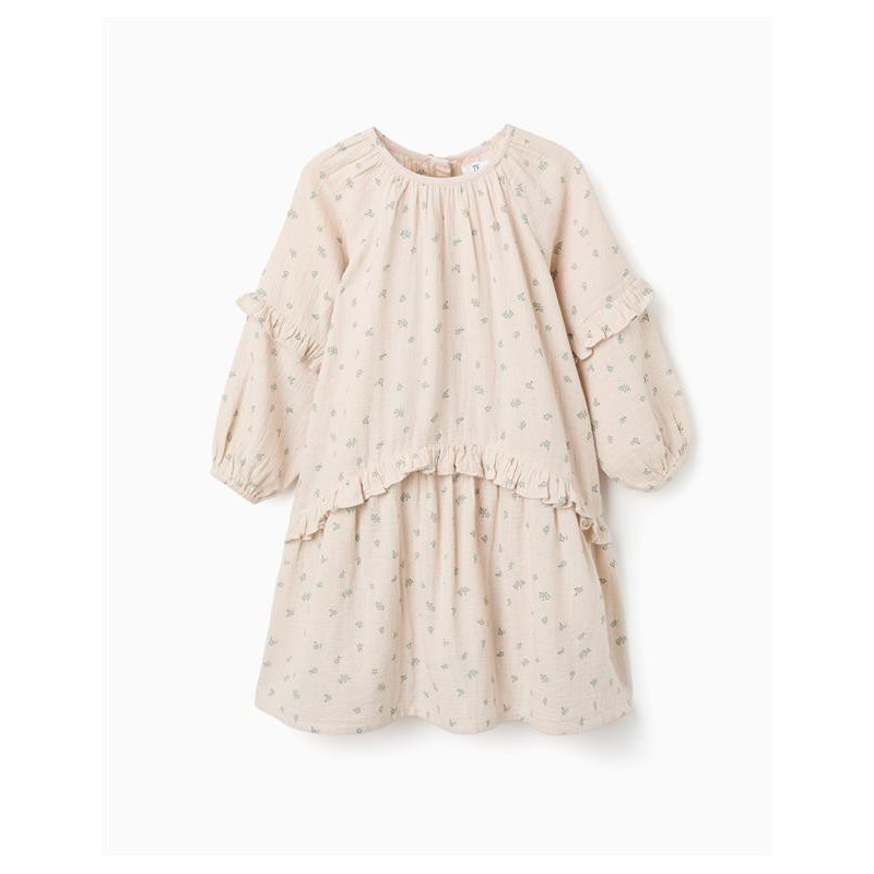 Este vestido es la prenda ideal para que las niñas disfruten de la máxima comodidad sin renunciar a un estilo dulce y encantador durante los días más calurosos Su diseño destaca por estar confeccionado en un suave tejido de muselina de algodón en color crudo, una textura ligera y muy transpirable ideal para pieles delicadas Presenta un delicado estampado de pequeñas florecitas en verde agua y rosa, que le aporta un aire rústico y romántico Cuenta con un corte amplio con volantes tanto en la cintura como en el pecho, aportando volumen y movimiento Sus mangas son largas y abullonadas con puños elásticos, y el cierre trasero es de botones para facilitar el cambio Es una prenda extremadamente versátil que combina a la perfección tanto con sandalias para un look de verano como con bailarinas para una ocasión más especial.